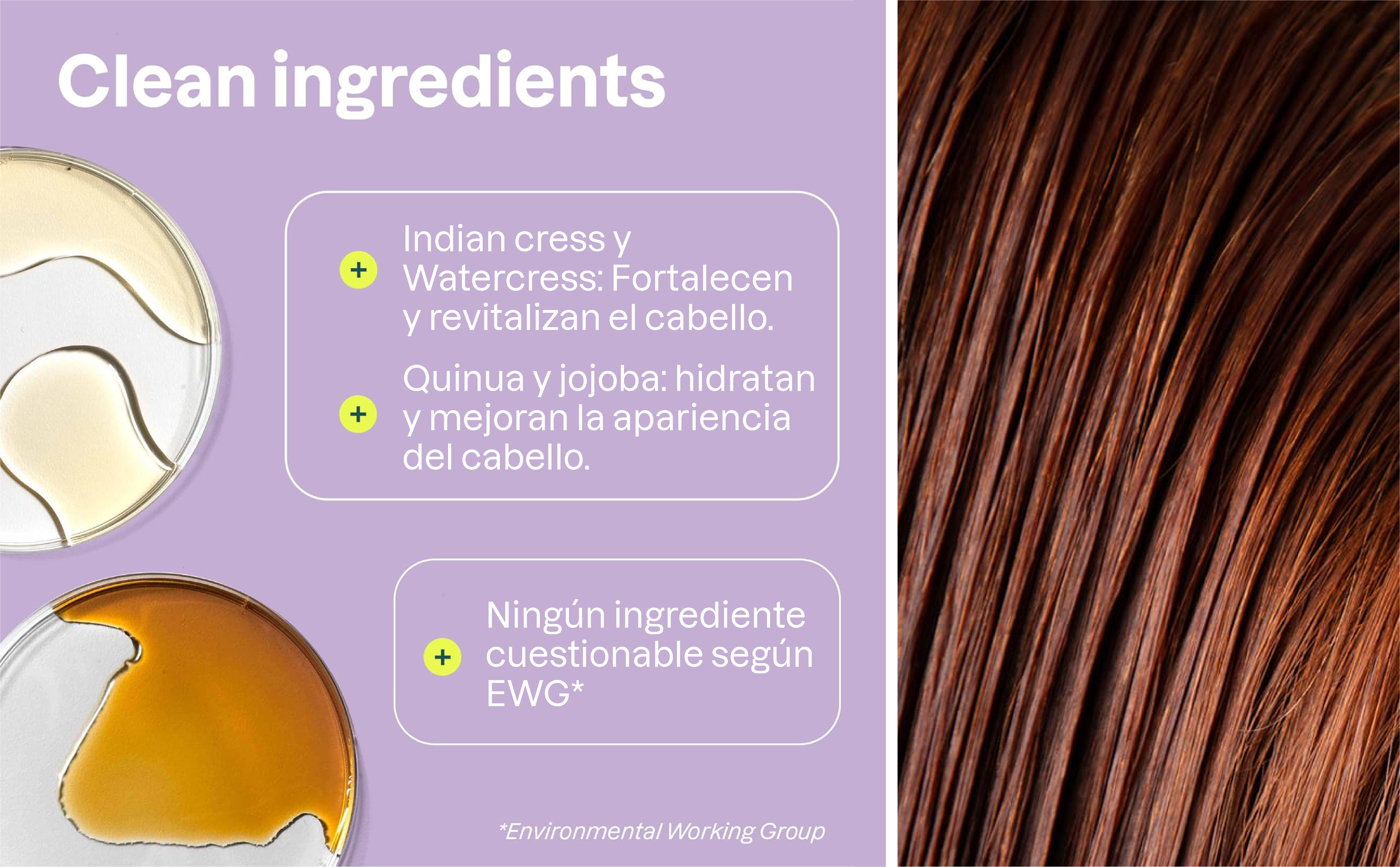 - La quinua y jojoba contienen una alta concentración de antioxidantes, además de ayudar en la restauración y protección del cabello, lo que contribuye a darle un brillo natural.