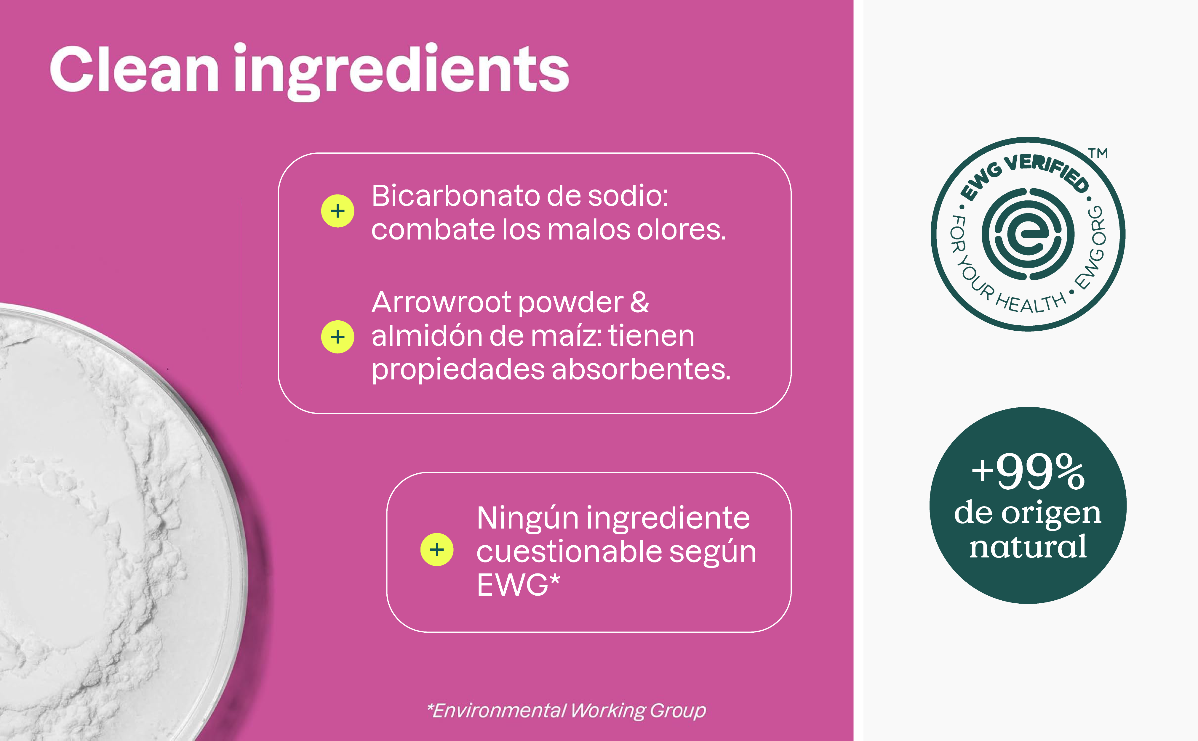 Nuestro desodorante EWG Verified proporciona una protección duradera, sin obstruir el sistema de sudor que regula la temperatura natural del cuerpo.