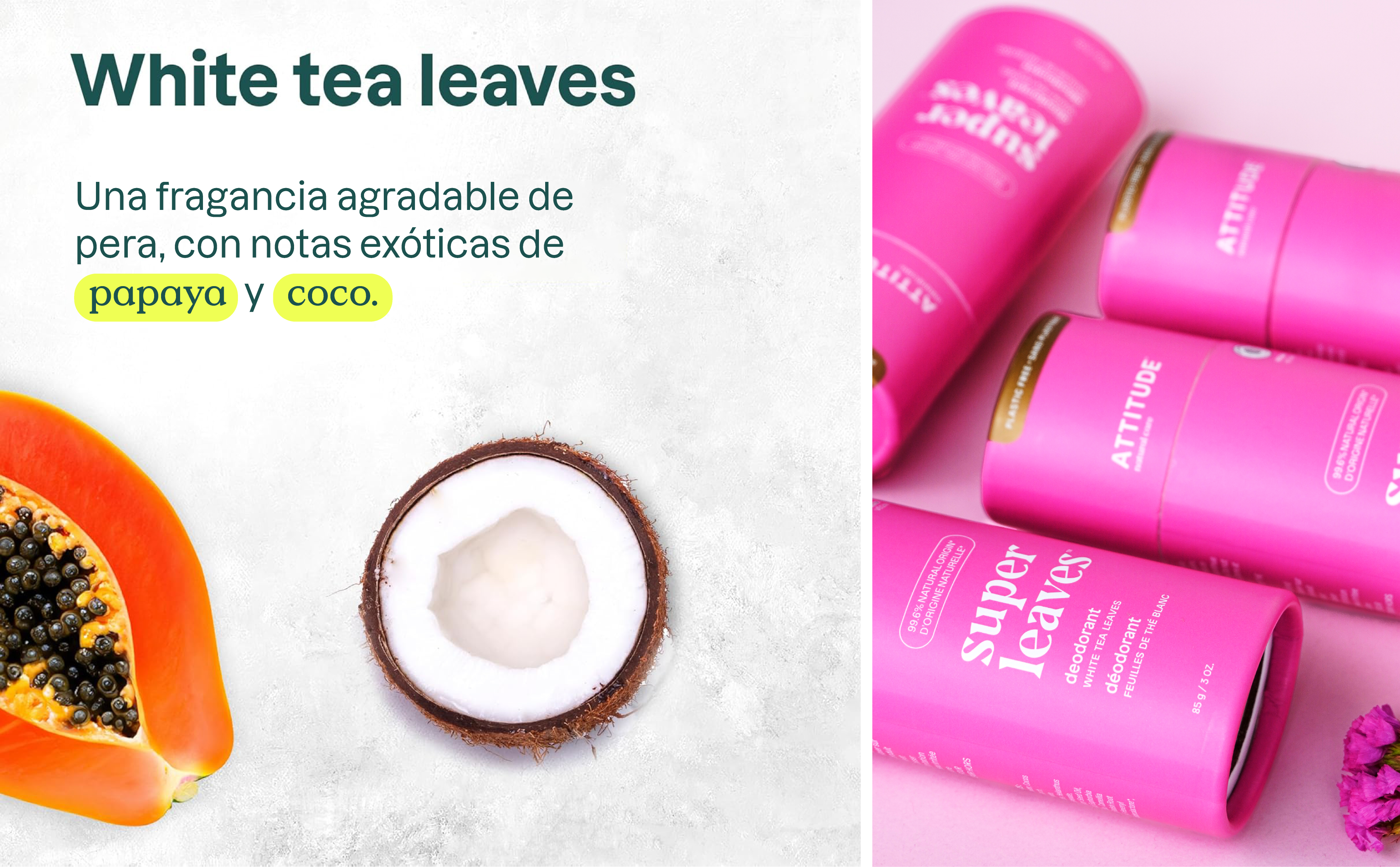Nuestro desodorante de té blanco está enriquecido con extracto de hoja de té blanco conocido por sus propiedades antioxidantes, hidratantes y calmantes. Presenta un aroma que nos recuerda a guayaba y frutos rojos