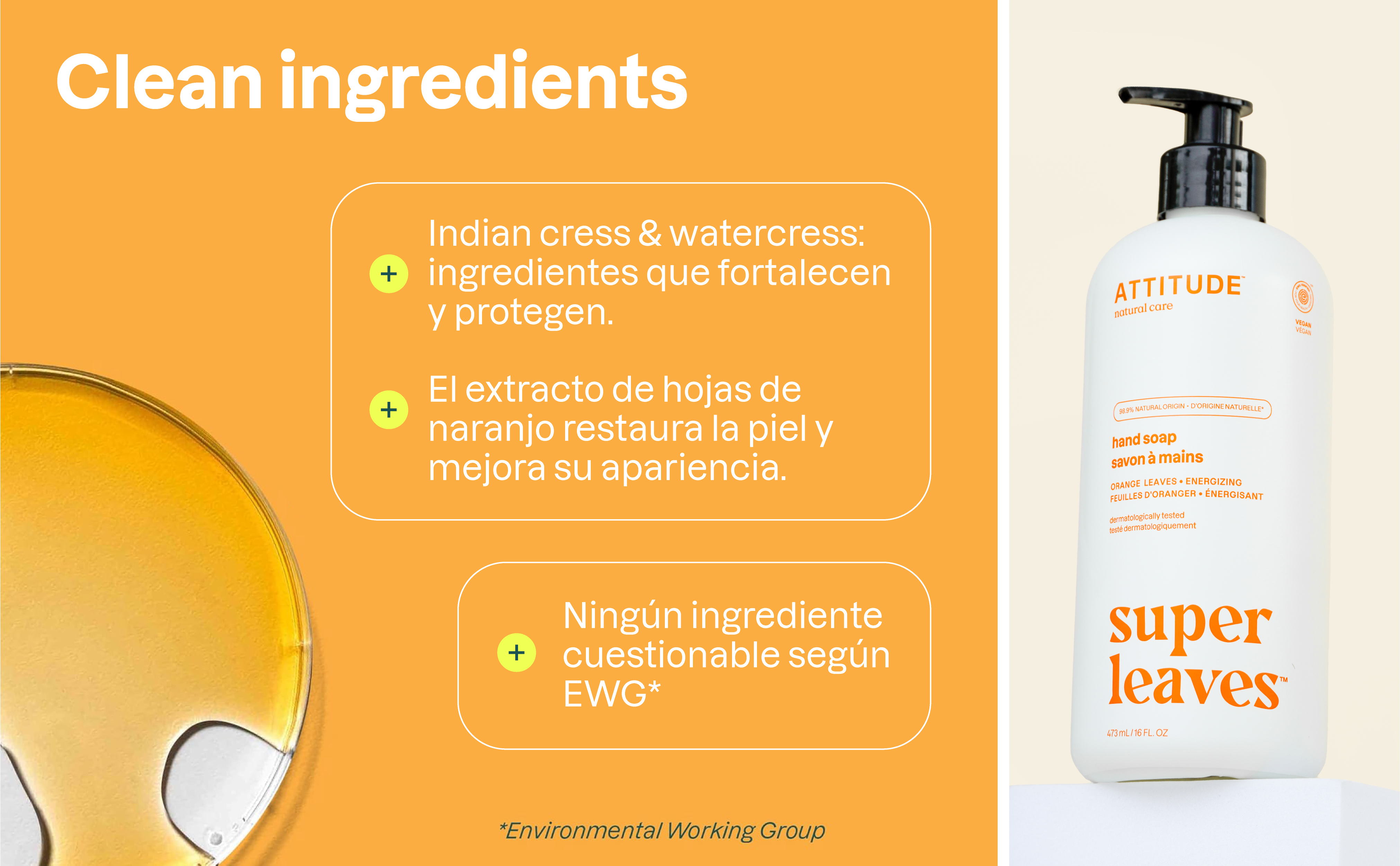 Con un aroma que nos recuerda a la naranja y al cardamomo, el Jabón para Manos Super Leaves de ATTITUDE está enriquecido con extracto de hoja de naranja para ayudar a refrescar y restaurar la piel.