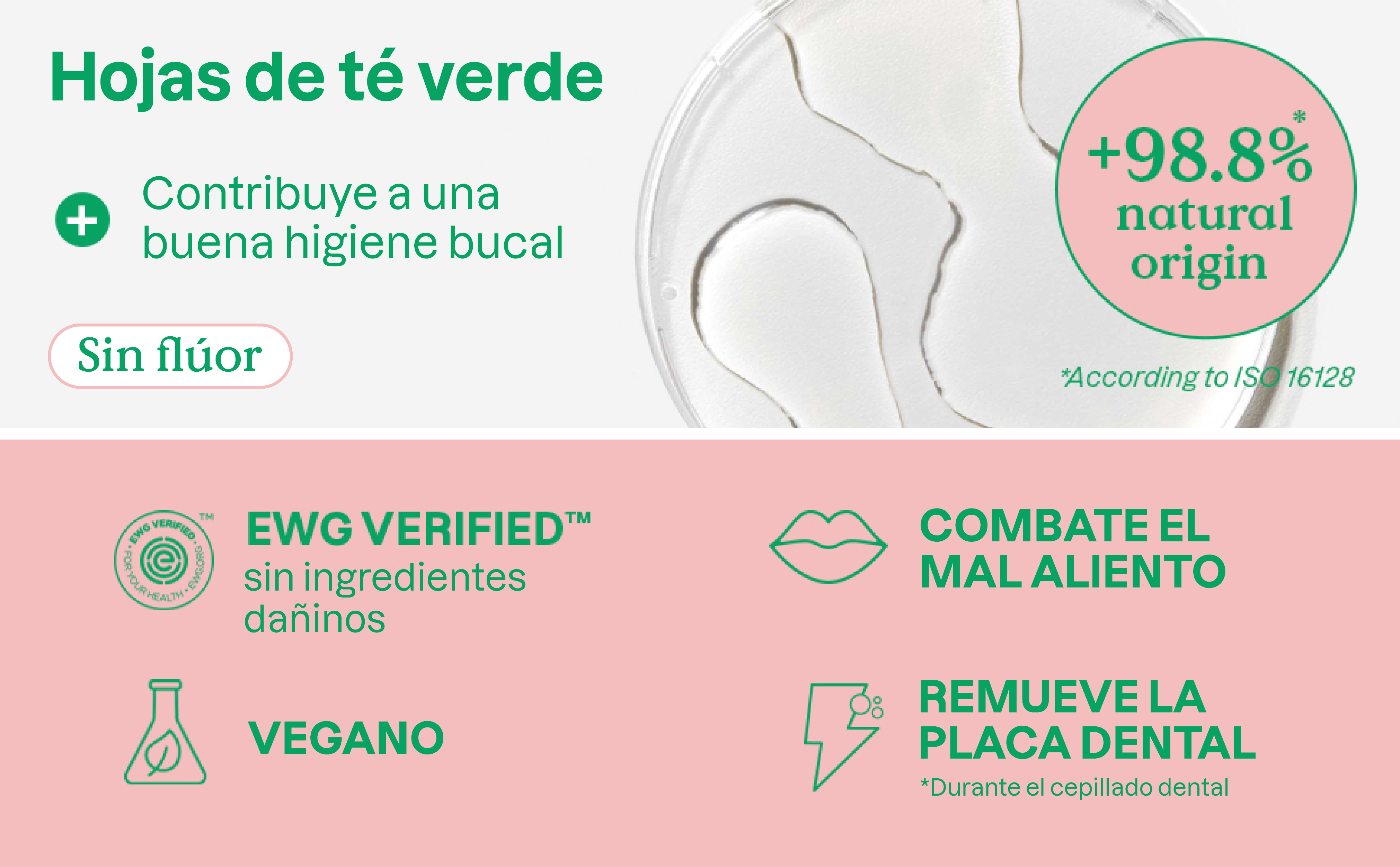 Nuestra pasta de dientes sin flúor contiene hojas de té verde que ayudan a mantener una buena salud bucal y dental gracias a su acción antibacteriana, y hojas de papaya (papaína), que combinadas con el cepillado contribuyen a reducir la placa.