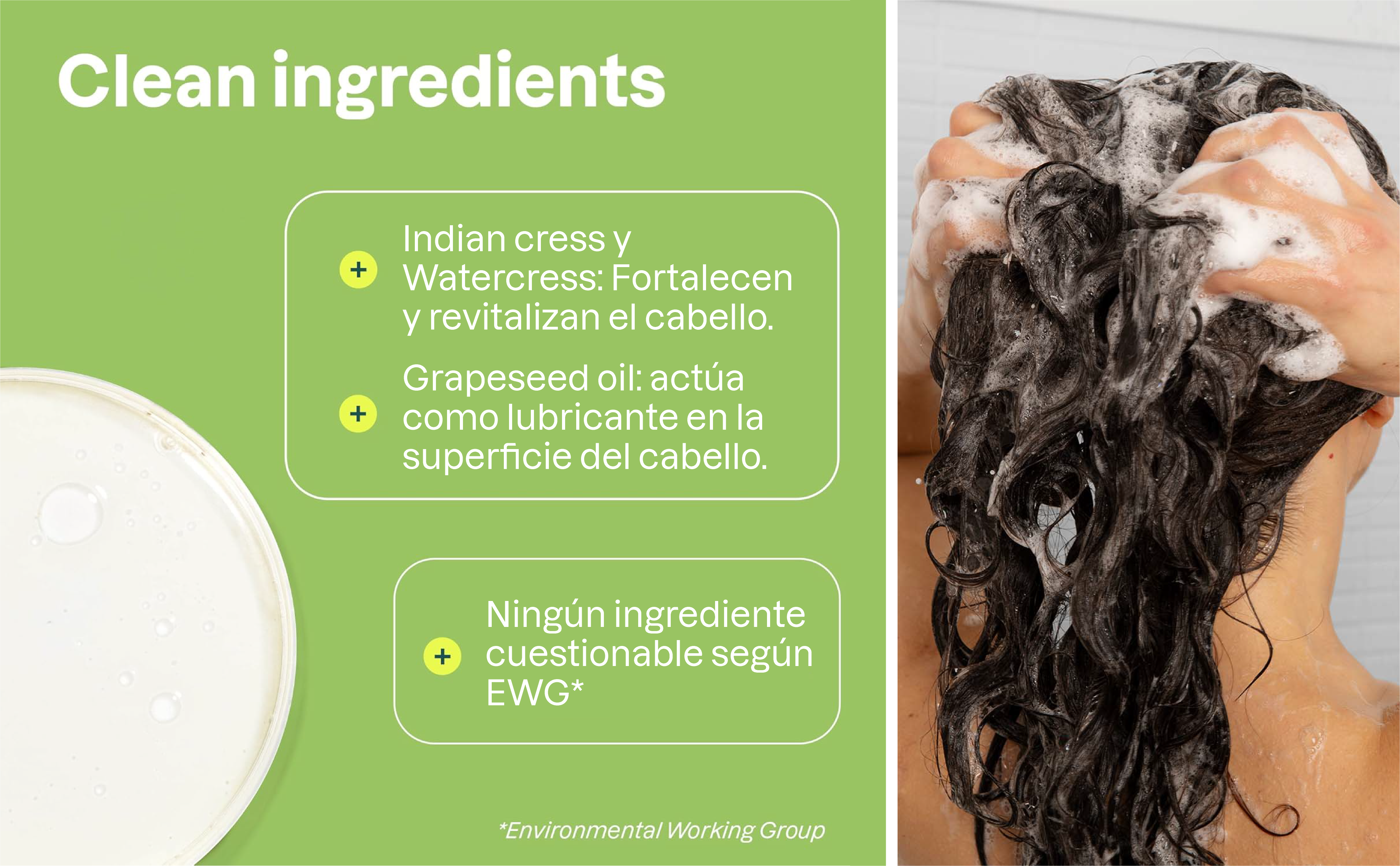 Aqua/water/eau (solvent), Sodium coco-sulfate (surfactant), Coco-glucoside (surfactant), Vegetable glycerin (humectant), Sodium cocoyl isethionate (surfactant), Lauryl glucoside (surfactant), Stearyl citrate (emollient), Citric acid (pH adjuster), Panthenol (vitamin B5 – hair conditioner), Glyceryl oleate (emulsifier), Sodium benzoate (active constituent), Inulin (emollient), Potassium sorbate (active constituent), Nasturtium officinale (watercress) extract (active constituent), Tropaeolum majus (Indian cress) extract (active constituent), Maltodextrin (binder), Moringa oleifera seed extract (anti-pollution active), Vitis vinifera (grape) seed oil (emollient), Olea europaea (olive) leaf extract (active constituent), Hexyl salicylate (floral – active constituent), Geranyl acetate (floral – active constituent), Methyl dihydrojasmonate (jasmine – active constituent).